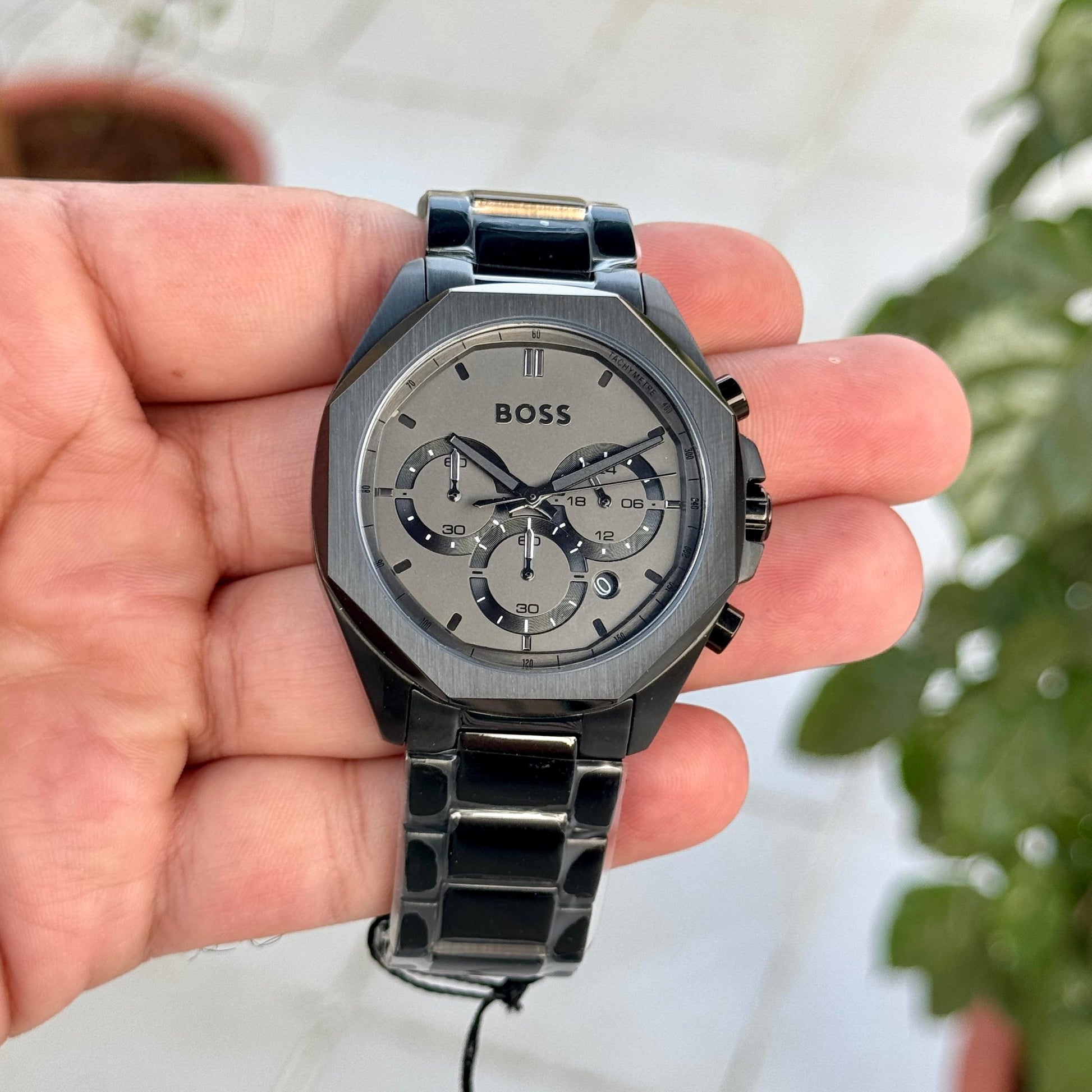 ππ½ Features: Powered by original Japanese Quartz machinery, Stainless-steel Black round case, mineral crystal glass on a Black Chronograph dial with Black indices and hands, fastened by a high quality Stainless-steel Black Metal Chain with a deployment clasp.